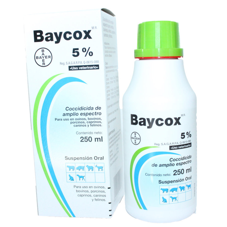Baycox 5% Suspensie orala 250 ml - Suspensie orala pentru prevenirea semnelor clinice ale coccidiozei neonatale la purcei si prevenirea si tratamentul coccidiozei la ovine. Compozitie Substante active: Toltrazuril 50.0 mg/ml. Excipienti: benzoat de sodiu (E211), propionat de sodiu (E281), docusat de sodiu, emulsie simeticon, bentonita, acid citric anhidru, guma Xantan, propilen glicol, apa purificata. Indicatii Suine: Pentru prevenirea semnelor clinice ale coccidiozei neonatale la purcei in ferme cu antecedente confirmate de coccidioza produsa de Isospora suis. Ovine: Pentru prevenirea si tratamentul coccidiozei la aparitia semnelor clinice de boala si reducerea coccidiilor din adaposturile de ovine, in fermele cu antecedente confirmate de coccidioza produsa de Eimeria crandallis si Eimeria ovinoidaliss Contraindicatii Nu se utilizeaza in caz de hipersensibilitate la substanta activa, la adjuvant sau la oricare dintre excipienti. Nu se utilizeaza pentru ovine in lactatie daca laptele este destinat pentru consum uman. Reactii adverse Nu sunt cunoscute. Specii tinta Suine (purcei), ovine (miei). Posologie pentru fiecare specie, cale de administrare si mod de administrare Suspensie orala gata de utilizare, trebuie agitata inainte de utilizare. 4 ml suspensie orala per 10kg greutate corporala. Fiecare animal trebuie tratat cu o singura administrare orala de 20 mg toltrazuril/kg greutate corporala echivalent cu 0,4 ml Baycox 5% suspensie orala pe kg greutate corporala. Pentru obtinerea unor rezultate foarte bune, animalele trebuiesc tratate inainte de aparitia semnelor clinice de ex. in perioada prepatenta. Efectul produsului este limitat atunci cand este observata diaree, deoarece peretele intestinal este deja afectat de coccidii. Suine:Purcei vor fi tratati in primele 3-5 zile de viata. Ovine: Miei care au varsta sub 5 luni - trebuiesc tratati inainte de prima saptamana de pasunat. Recomandari privind administrarea corecta Nu exista. Timp de asteptare Suine carne si organe: 77 zile. Ovine carne si organe: 42 zile. Precautii speciale pentru depozitare Niciuna. Perioada de valabilitate dupa deschiderea flaconului: 12 saptamani. A nu se utiliza dupa data expirarii marcata pe eticheta: Exp: LL/AAAA Atentionare speciala In caz de contact accidental al produsului cu pielea sau cu ochii spalatii imediat cu apa. Precautii speciale pentru eliminarea produsului neutilizat sau a deseurilor, dupa caz Orice produs sau material rezidual provenit din aceste produse trebuiesc eliminate in conformitate cu reglementarile nationale. Alte informatii Natura si compozitia ambalajului primar Flacoane de polietilena de inalta densitate, continand 250 ml de suspensie alba sau galbuie, cu capac de culoare verde. Proprietati farmacodinamice Toltrazuril este un derivat de triazinon. Acesta actioneaza impotriva coccidiilor din genurile Isospora si Eimeria. El este activ impotriva tuturor stagiilor intracelulare de dezvoltare ale coccidiilor de la merogoni (multiplicare asexuata) si gamogoni (faza sexuala). Toate stagiile sunt distruse si de aici modul sau de actiune coccidiocid. Proprietati farmacocinetice Dupa administrarea orala la mamifere toltrazuril este incet absorbit. Principalul metabolit este toltrazuril sulfona. Eliminarea toltrazurilului este inceata iar timpul de injumatatire este de aproximativ 3 zile. Principala cale de eliminare este prin fecale. Pentru orice informatii referitoare la acest produs medicinal veterinar, va rugam sa contactati reprezentantul local al detinatorului autorizatiei de comercializare.