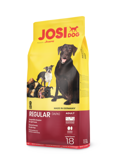 Formula fină, fără gluten a lui JosiDog Regular este potrivită pentru câinii cu cerințe de energie ușor ridicate. Furaj complet pentru câini adulți. Compoziție: porumb cu cereale integrale; proteine uscate de pasare; grăsime de pasăre; fibra de sfecla; făină de carne și oase; proteine animale hidrolizate; minerale; rădăcină de cicoare măcinată (sursă naturală de inulină); carne uscată din midia cu buze verzi din Noua Zeelandă. Saci de 18kg
